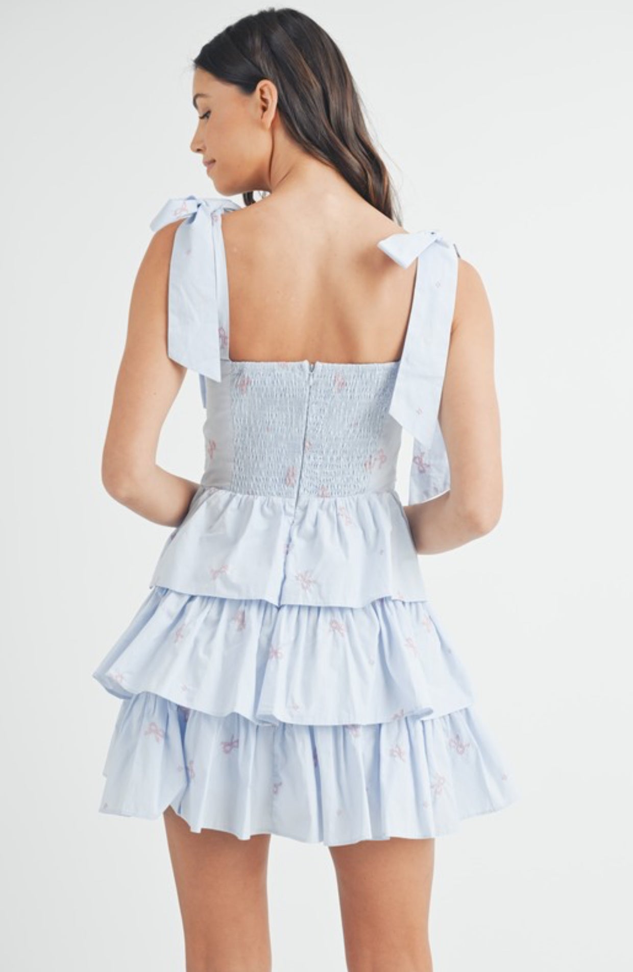 This Corset Tiered Mini Dress is crafted from solid poplin with a rayon blend, featuring a unique tie corset and shoulder bow tie details. Elegant and feminine, the dress is accented with a delicate bow embroidery print, perfect for a special occasion.